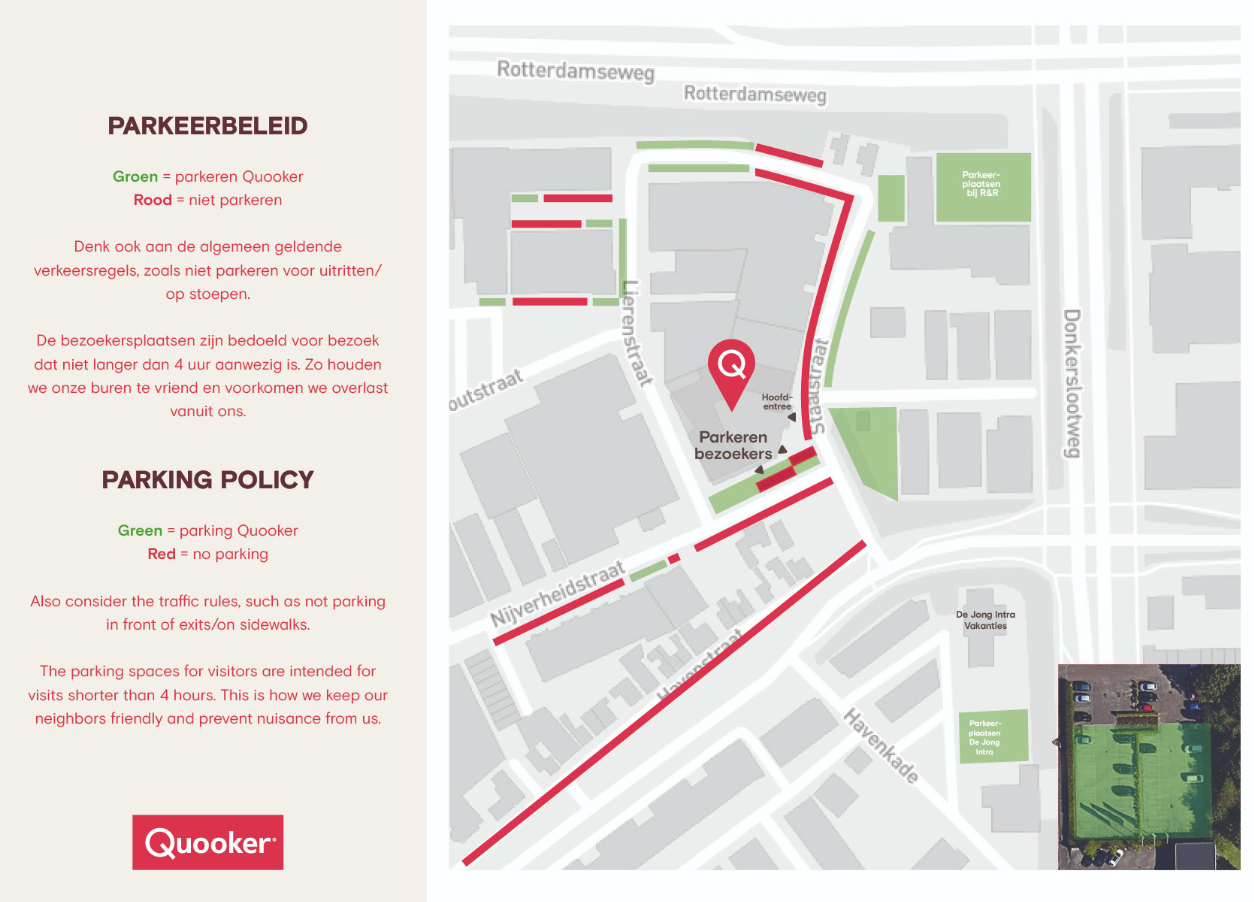 • Parkeren verloopt volgens het parkeerbeleid van de organisatie Quooker. De richtlijnen staan hier beschreven.
